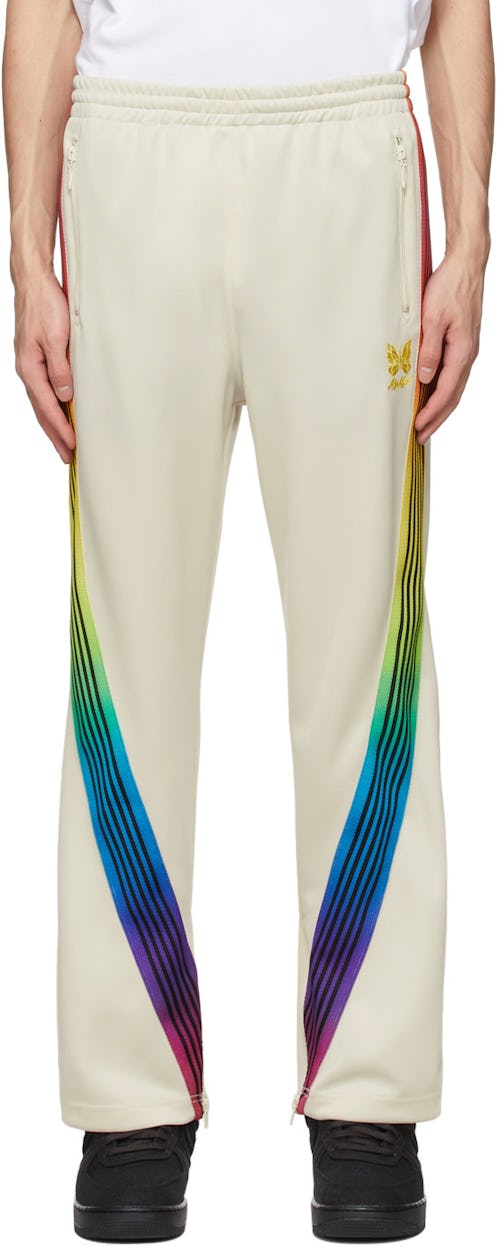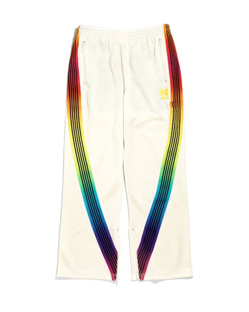 Needles, the Nepenthes owned brand out of Japan, makes the track pant of choice for fashion killa’ A$AP Rocky. The rapper’s AWGE brand has made the relationship official on several ocassions through collabs, the most recent of which features a flight suit-like “V” made out of rainbow stripes.