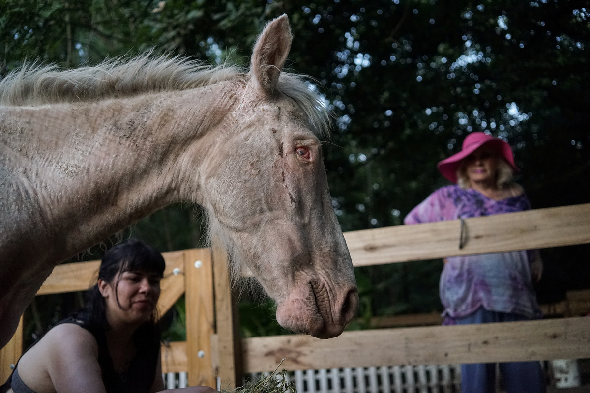 Gabriela Bezerica (R) and a volunteer look at a mistreated horse that had been dropped off at the animal sanctuary "Animal Paradise," managed by Gabriela and her husband Armando Scoppa for over a quarter of a century, in General Rodriguez, Argentina January 25, 2020. Picture taken January 25, 2020. REUTERS/Mariana Greif