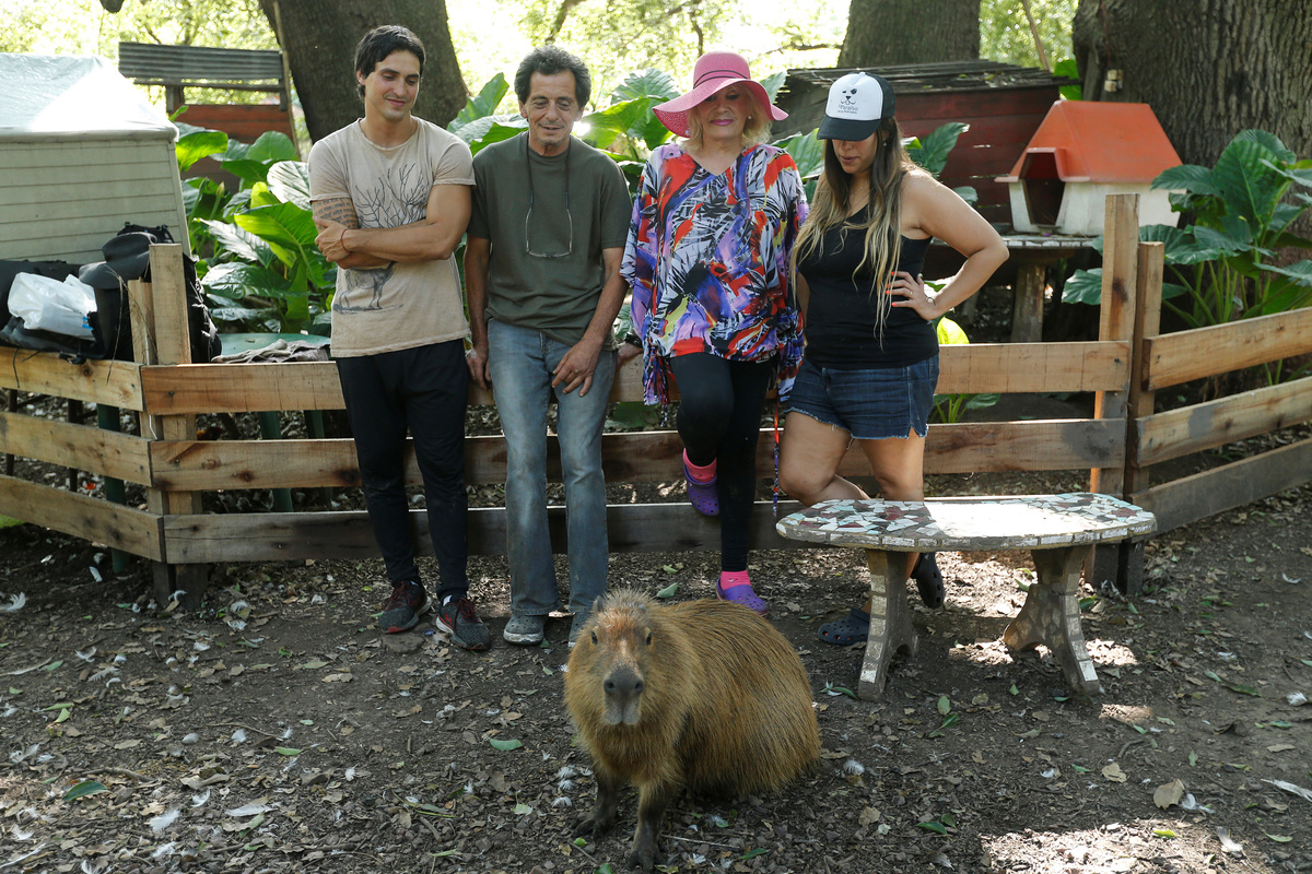 Gabriela Bezeric (2nd R) and her husband Armando Scoppa (2nd L) pose for a photograph with volunteers Facundo Palomino and Yamila Budoff and a rescued capybara at their animal sanctuary "Animal Paradise," in General Rodriguez, Argentina January 24, 2020. Picture taken January 24, 2020. REUTERS/Mariana Greif
