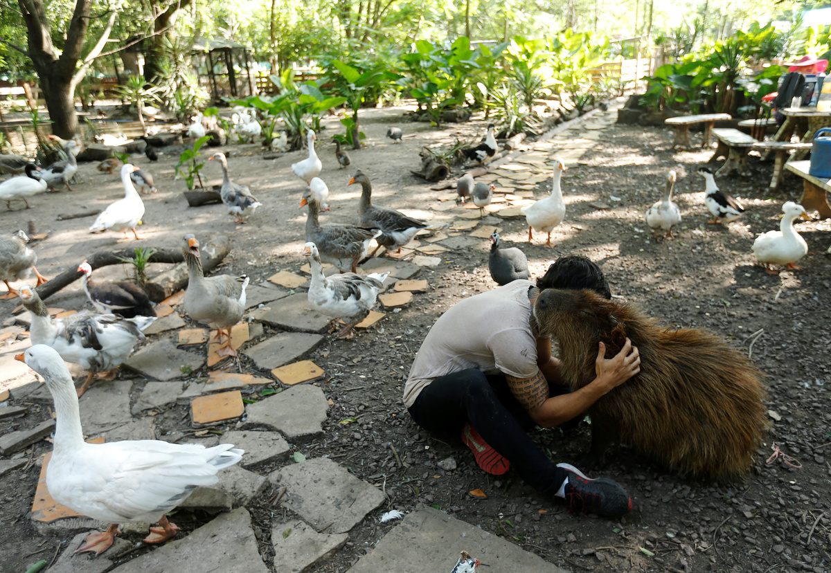 Volunteer Facundo Palomino hugs a rescued capybara at the animal sanctuary "Animal Paradise," managed by couple Gabriela Bezeric and Armando Scoppa for over a quarter of a century, in General Rodriguez, Argentina January 24, 2020. Picture taken January 24, 2020. REUTERS/Mariana Greif