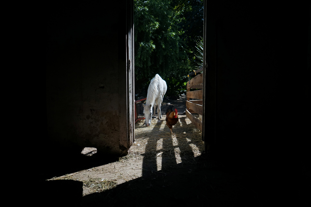 A rescued horse and a rescued rooster are seen outside a shed at the animal sanctuary "Animal Paradise," that has been managed by couple Gabriela Bezeric and Armando Scoppa for over a quarter of a century, in General Rodriguez, Argentina January 25, 2020. Picture taken January 25, 2020. REUTERS/Mariana Greif