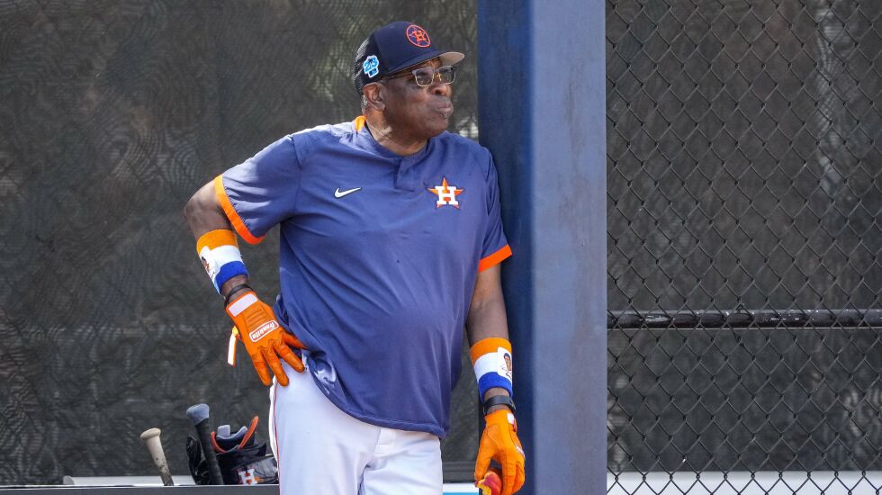 WEST PALM BEACH, Fla. — Dusty Baker wore blue-white-and-orange wristbands with his name and image on them, pulled tight over his still-powerful forearms. Orange batting gloves covered his extra-large hands. And his shoes? On point as always. That is, if sneakers that are orange, red, teal and green with navy blue lettering on them — yes, all the same time — can possibly look good.