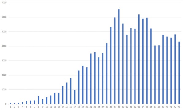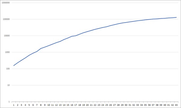 Like the log scale graph, the graph above also shows that the daily rate of increase in total cases has dropped steadily over the 43 days.