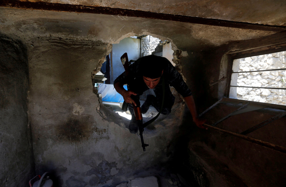 A member of Iraqi Federal Police crosses from one house to another through a hole in the wall at the frontline in the Old City of Mosul, Iraq, June 27, 2017. Alaa Al-Marjani: "We were on a media tour guided by the Iraqi Federal Police forces in the old city of Mosul. We got out of vehicles and started walking. The forces were advancing rapidly through holes they had made in the walls of buildings to avoid being targeted by Islamic State fire. I was happy that I got access to get my pictures and return safe." REUTERS/Alaa Al-Marjani/File Photo