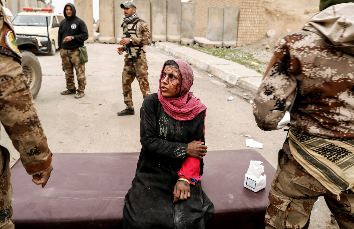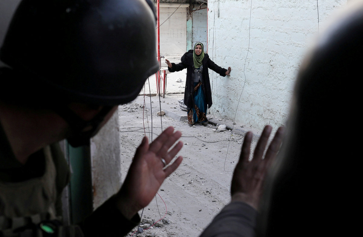 A woman gestures as she approaches Iraqi Special Forces soldiers during a battle in Mosul, Iraq, March 1, 2017. Goran Tomasevic: "The woman was accused of helping ISIS. An Iraqi Special Forces soldier told me he saw the woman carrying an RPG across the street and giving it to ISIS fighters. When she came close to Iraqi Special Forces soldiers they were worried that she might have suicide vest. She was escorted later to an Iraqi Army field command centre." REUTERS/Goran Tomasevic/File Photo