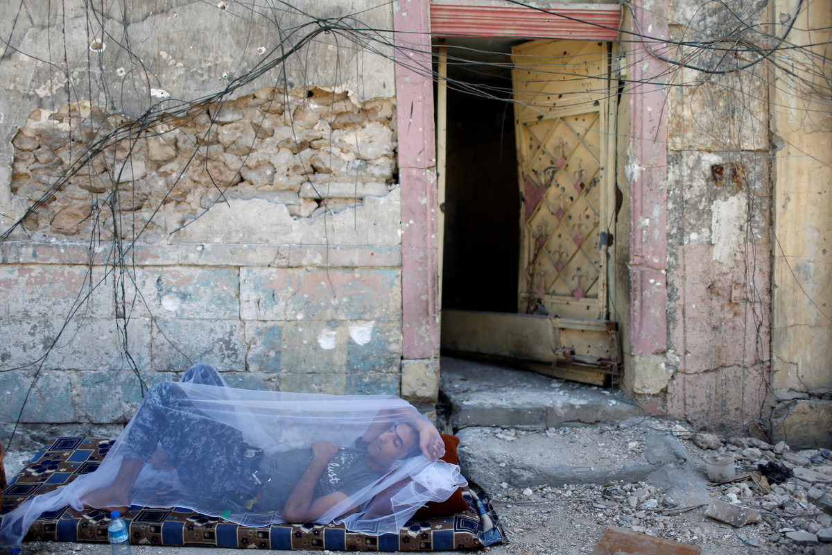 A member of the Iraqi Federal Police rests at the frontline in the Old City of Mosul, Iraq, June 28, 2017. Ahmed Jadallah: "I left Erbil early in the morning bound for Mosul with our multimedia team and security adviser in an armoured car. After an almost three-hour drive, passing many Kurdish Peshmerga and Iraqi military checkpoints, we crossed the Tigris river and reached the headquarters of the Iraqi Federal Police in western Mosul. An hour later a Federal Police convoy escorted us to the frontline in the Old City. There, while covering a battle between Federal Police and Islamic State, I passed the soldier in the photograph. He was taking a rest in a temporarily more sheltered spot and draped himself with a net to keep away clouds of insects that had been attracted by dead bodies and raw sewage nearby. The picture shows the rough conditions of the frontline where there is no decent place to sleep while the fighting carries on. Just one mistake of walking down a street in the wrong direction could have landed me in the deadly hands of Islamic State. The most important thing is to stay out of sight of Islamic State snipers and drones. Of all the wars I have covered in various countries, Mosul has been the worst." REUTERS/Ahmed Jadallah/File Photo