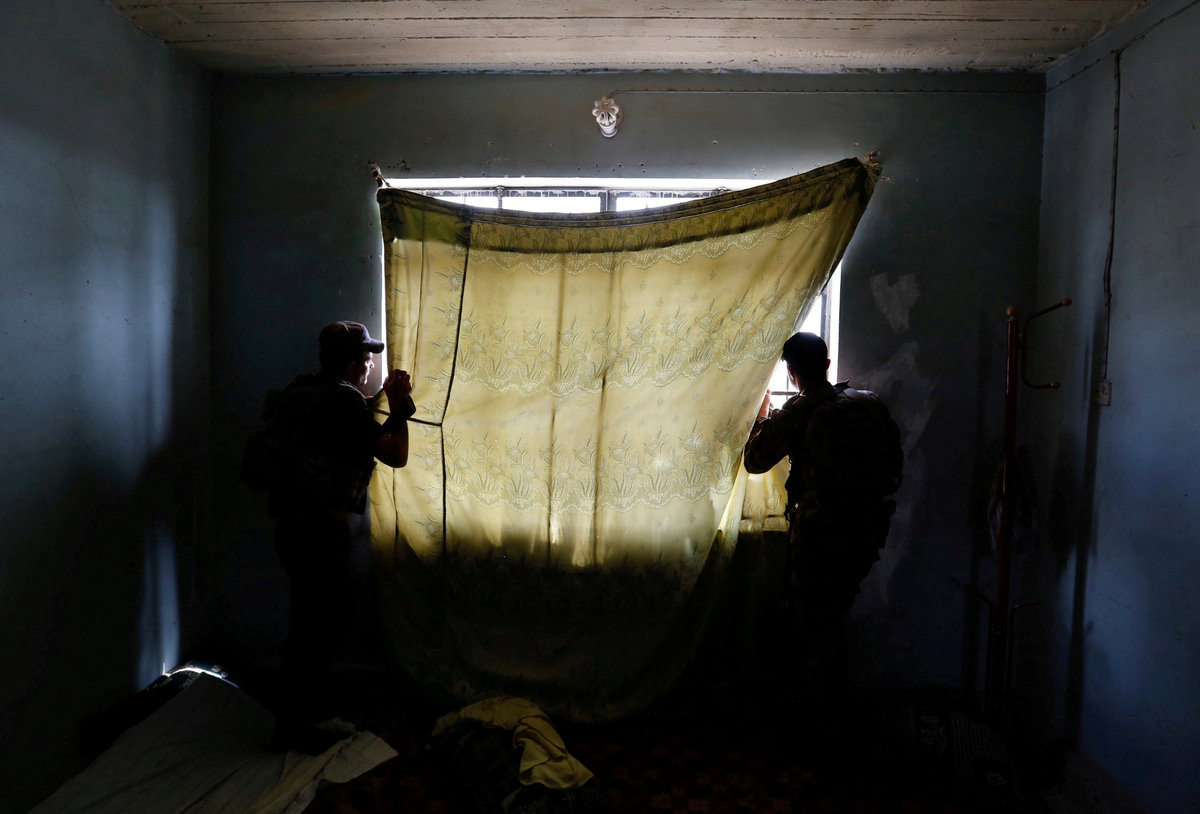 Members of the Iraqi Counter Terrorism Service (CTS) forces look at the positions of Islamic State militants during clashes in western Mosul, Iraq, May 15, 2017. Danish Siddiqui: "In May, I was accompanying a senior commander of Counter Terrorism Service, an elite Iraqi security force trained by the U.S., during the battle to take control of Western Mosul. We arrived at a small house on the frontline after walking through holes in the walls between homes. Islamic State snipers were firing a few hundred meters away. The people who once lived there departed quickly, leaving clothes and toys scattered across the floor. The next inhabitants left hollow shell casings. The CTS had taken over the house a day ago. The curtain was a bed sheet. They stood behind it to identify enemy snipers and watch one of their own. It's a quiet picture that tells of even the most uneventful of moments on the front, when nothing may happen, and everything is possible." REUTERS/Danish Siddiqui/File photo