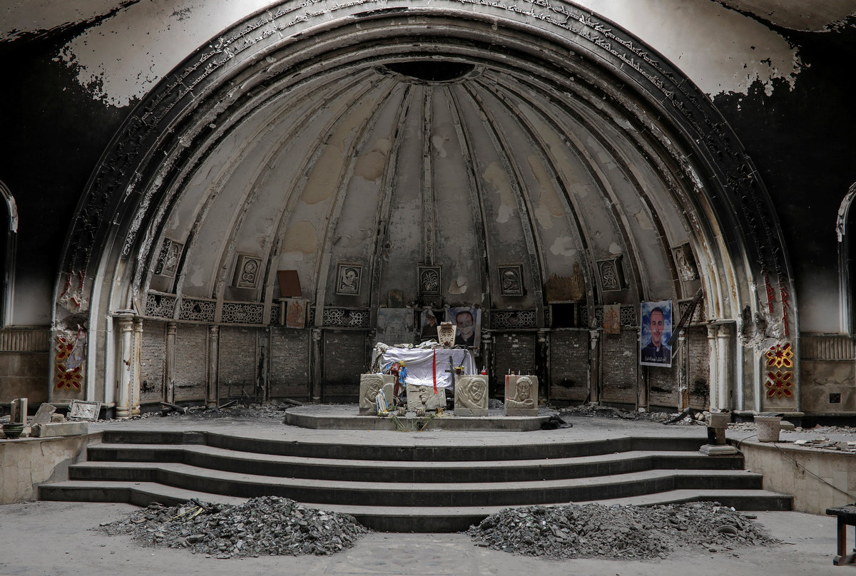 An altar of a damaged church is seen in the town of Qaraqosh, south of Mosul, Iraq, April 11, 2017. Marko Djurica: "In April 2017 I was on an assignment in Iraq, covering the battle between Iraqi forces and Islamic State fighters. Every day the Reuters team would go to the frontline from Erbil to west Mosul where the fights were going on. Each day on the road we would pass the small town of Qaraqosh. Once home for about 50,000 mostly Iraqi Christians, now it was completely empty, a ghost town. Iraqi forces kicked out Islamic State fighters but citizens were still afraid to go back to their homes. The town once had 12 churches with one more than 1000 years old. Now all were destroyed or badly ruined. Burnt-out altar of a church was one of the images I took that made me very sad." REUTERS/Marko Djurica/File Photo