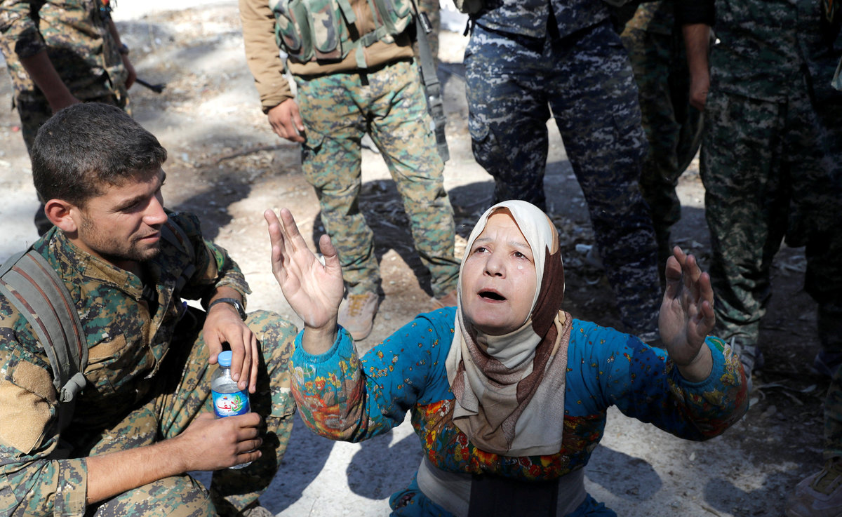 A civilian prays after she was rescued by fighters of Syrian Democratic Forces from the stadium after Raqqa was liberated from the Islamic State militants in Raqqa, Syria, October 17, 2017. Erik De Castro: "The day Raqqa was liberated I arrived at the frontline and noticed there were no more plumes of smokes from air strikes and no more sounds of gunfire. I took pictures of dozens of Syrian Democratic Forces as they marched towards the stadium which was Islamic State fighters' last stand. The atmosphere was euphoric, especially when fighters were cheering while sitting on top of armoured vehicles and a tank parading around the infamous roundabout of Dawwar al-Naim where the Islamic State militants used to execute people and hang their heads. I then noticed SDF Fighters running towards the far end of the stadium and followed them. I took pictures of an elderly woman being carried by the fighters. They gave her water and food, the woman said she was hiding in the rubble of a house beside the stadium during the fighting and air strikes. She also said other members of her families, two daughters and a son did not survive. After being rescued, she was crying along a sidewalk and praying." REUTERS/Erik De Castro/File Photo