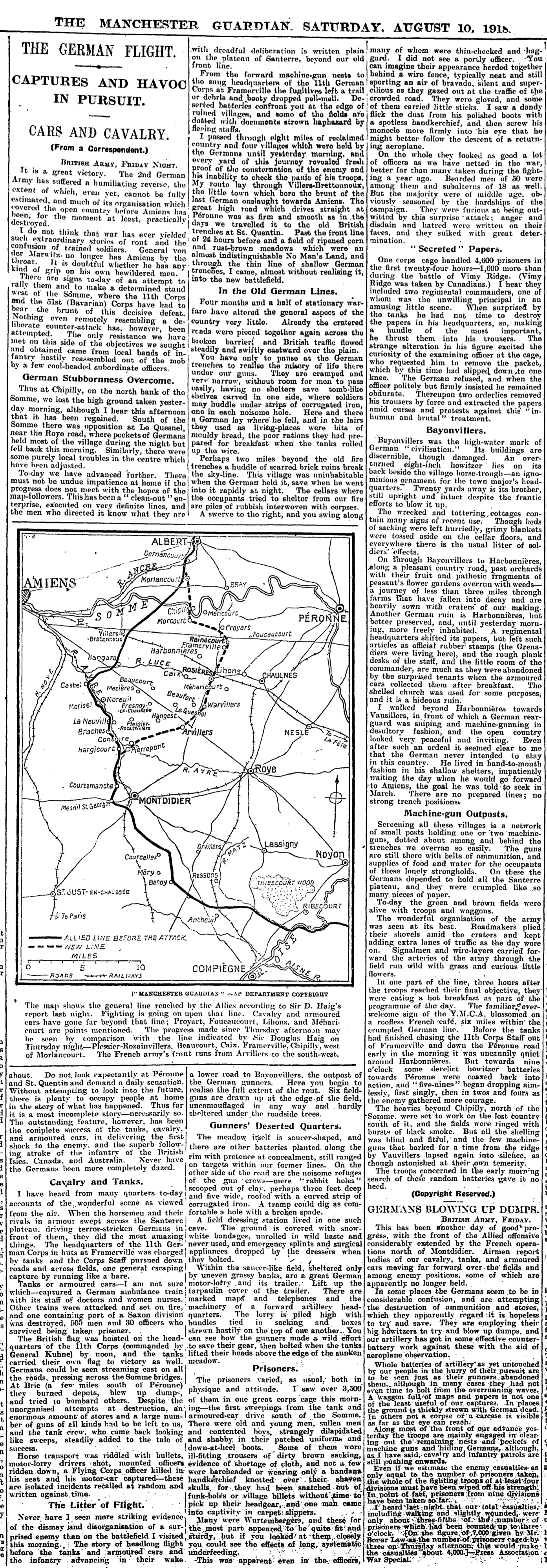 On 8 August 1918, British, French, Australian and Canadian troops launched a surprise offensive directed against the Germans near the city of Amiens. The attack was a complete success and the Battle of Amiens marked the beginning of the end of the first world war. A Manchester Guardian reporter describes the German retreat.