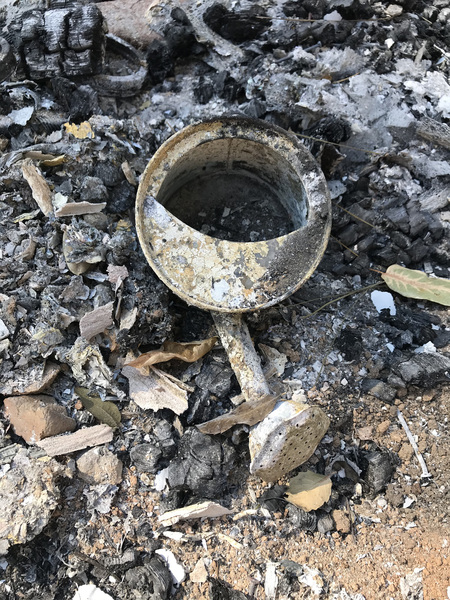 The fire decimated entire structures but left certain relics untouched: a white lamppost, a green storage container, an American flag, a pile of broken dishes where a cupboard burned.