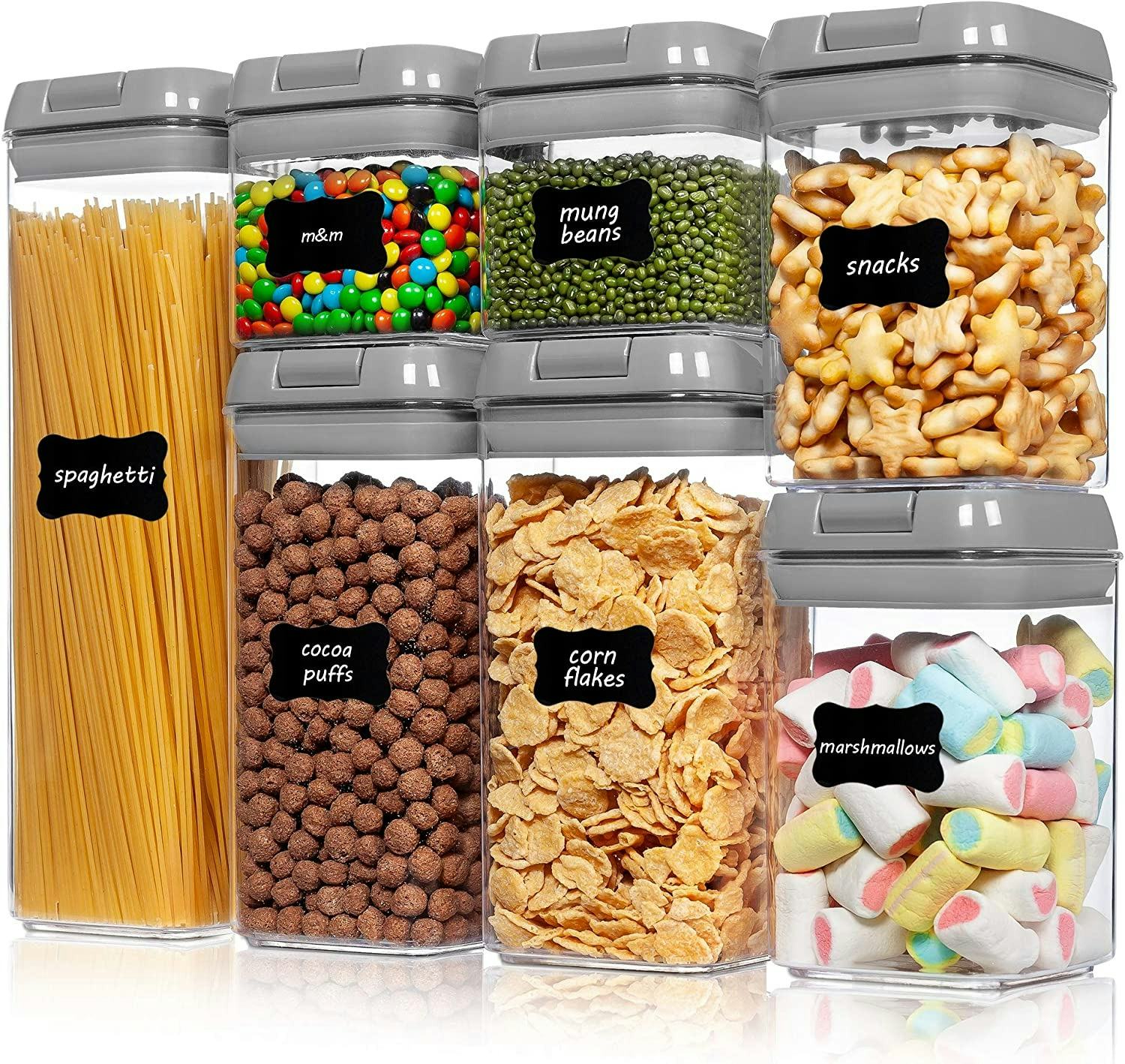 This set of seven plastic containers makes a kitchen counter or pantry look so put-together. With an assortment of sizes for pasta, snacks, sugar, and other dry goods, these containers are made from BPA-free plastic and come with airtight storage lids. A useful bonus: You’ll get 24 reusable labels so you can keep track of each food item’s freshness.