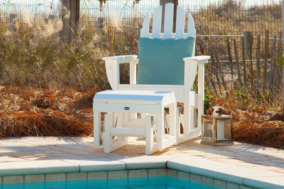 The difference between a rocking chair and glider has to do with movement. Whereas a rocker sways in an arcing motion, a glider moves back and forth on a fixed path. A glider’s smooth ride requires a mechanism, which explains why this second Polywood entry seems a bit bottom-heavy. To make it disappear, choose a color that blends into the immediate surroundings. Irrespective of color, Polywood’s surfaces are fade-resistant and backed by a 20-year warranty.