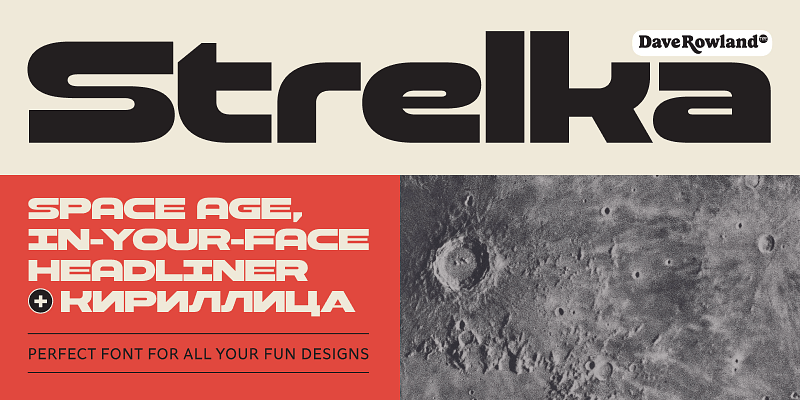 Created by type designer Dave Rowland, Strelka is an ultra-modern space-age-inspired headline font. The design provides small caps, various alternates for Latin glyphs and even automatic fractions for cookbooks.