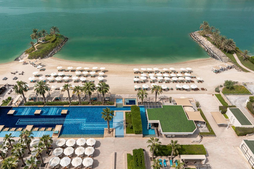 Stroll along the boardwalks through the grass-topped dunes, and you’ll find the azure shallows and pristine sands of Saadiyat Beach. This 9km-coastline is a protected nature reserve, where sea turtles come to nest on the sand and dolphins are frequently sighted on calm days – and the St. Regis sits right on the waterfront. Though it’s just a 15-minute drive from the city centre and 10 minutes from the Louvre museum, this resort’s vibe is unashamedly fly-and-flop: dapper waiters bring snacks and drinks straight to your sun lounger, while the watersports hub offers kayaks, SUPs and boogie boards.