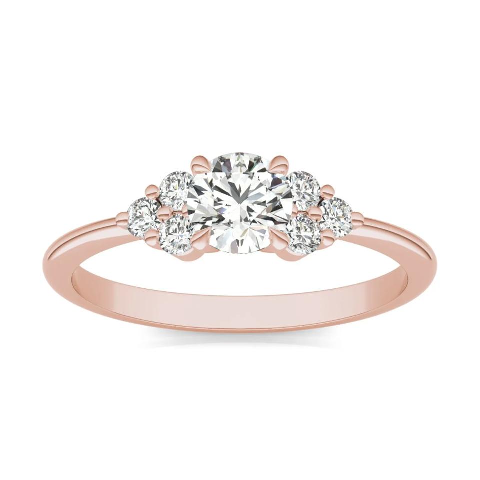 Featuring a 0.50 total carat weight Caydia lab-grown round diamond and set in 14K rose gold, this ring is adorned with intricate side stones. Charles & Colvard only uses stones of VS1 quality, which are sought out for their high polish and symmetry.