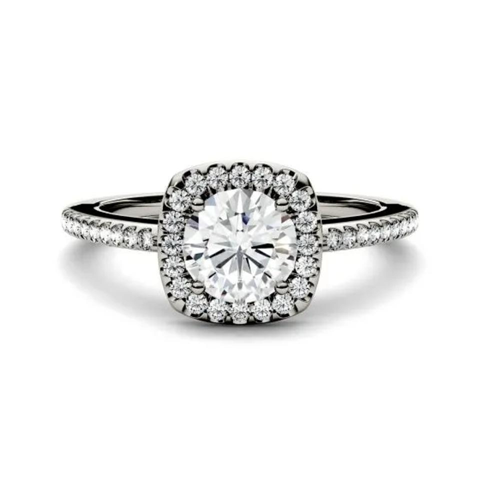 Charles & Colvard’s “Forever One Moissanite” is naturally occurring gemstone that resembles a diamond for its clarity and brilliance. This ring features a round cut center stone with a halo frame of 20 gems set in 14K gold.