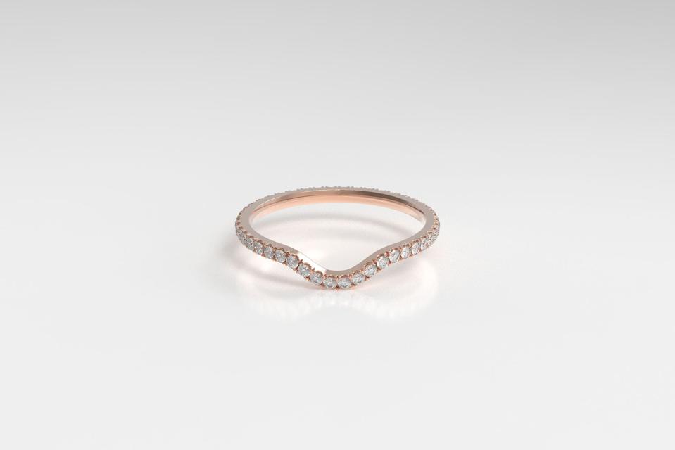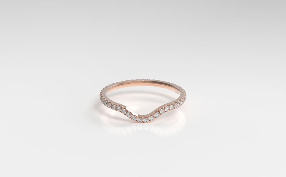 This versatile ring can be worn as an engagement ring or wedding band, depending on your style. It’s studded with ethical, lab-grown diamonds and has a curved silhouette, which fits snugly next to one to two carat solitaire rings or is stunning on its own.