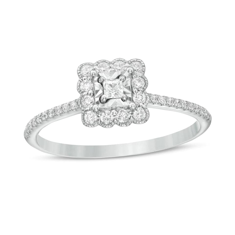 Cast in 10K white gold, this delicate ring has 1/20 ct. princess-cut diamond, specifically set to enhance its size and sparkle. The scalloped frame features diamonds and milgrain borders, which adds a unique heirloom quality to this find.