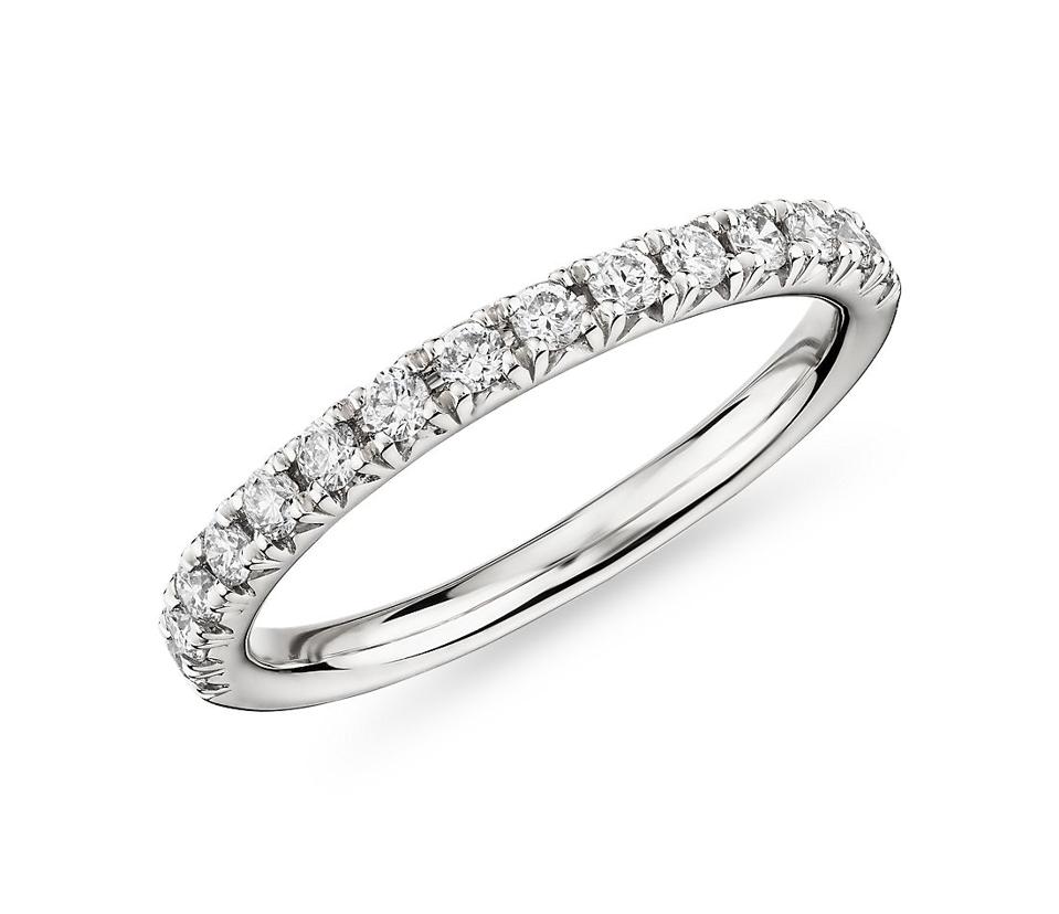 This wedding band goes beautiful with any style of engagement ring. The 14k white gold band radiates with 15 round-cut diamonds within a French pavé setting.