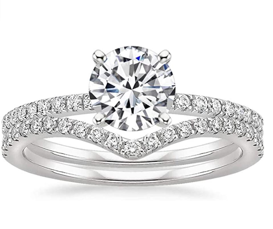 Etsy is a surprisingly under-the-radar source for top-notch engagement rings made by jewelers you can work with one-on-one. Molly Jewelry has Star Seller status (with more than 9,000 sales and extremely high ratings). This set features a large oval marquise moissanite stone with a vintage-inspired setting, which can be wrought from white, rose or yellow gold, and includes a wedding band as well.