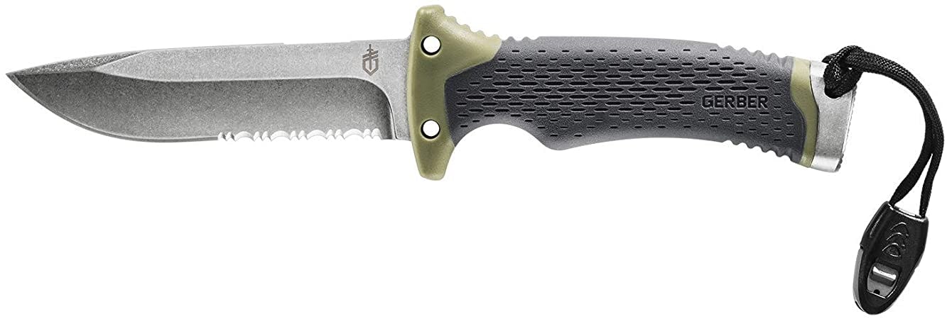 If you're looking for an excellent all-around camping knife with a fixed blade, this option from Gerber is one of the best out there. With a sturdy, straightforward design, the blade is made of strong stainless steel. Its partially serrated on one end, making it versatile for around camp uses, and the rubber handle offers solid grip. The knife's protective sheath features a sharpener on one side and a rod fire starter on the other, and there's also a small emergency whistle on the lanyard. I've tried this knife myself and, in addition to cutting easily, it feels solid in your hands.