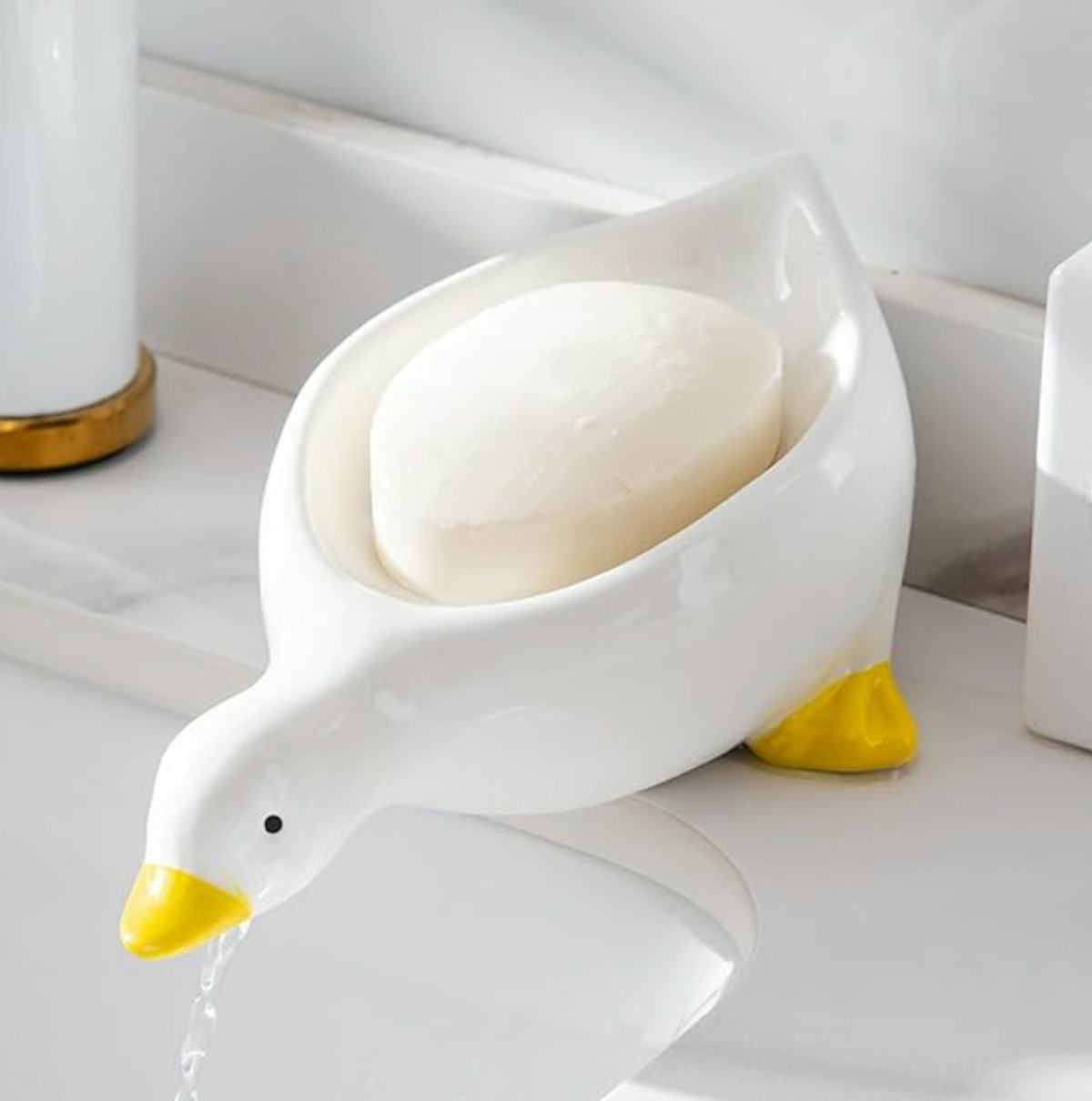 A duck-shaped soap dish that automatically drains excess water