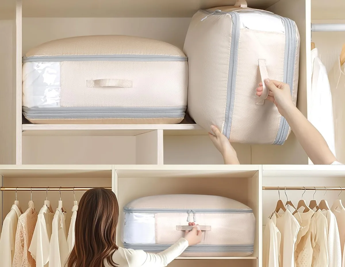 Fluffy comforters can take up a ton of closet storage space. Luckily, these bags are an easy fix. They help compress down bulky linens, making them a clever way to help save storage space. The tough nylon material is also washable as well as tear-resistant — and the handles on either side are reinforced for added durability.