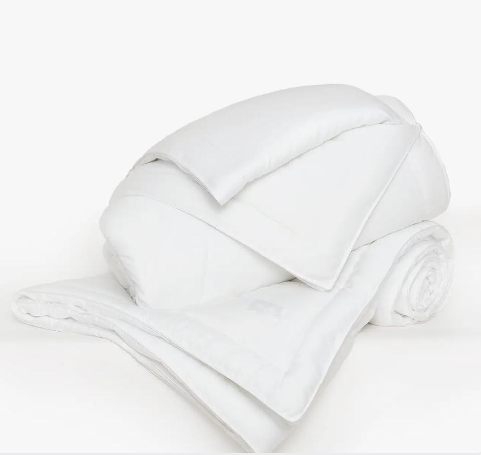 Parachute is our go-to shop for luxe organic bedding that channels a minimalist vibe. An all-season warmth option is also available, but we particularly love that Parachute’s lightweight down alternative comforter doesn’t skimp on coziness. It’s filled with hypoallergenic microfiber that mimics the insulation and fluffiness of down, but without the feathers.