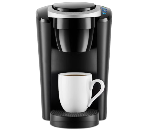 Brew K-Cups in less than a minute with this compact Keurig coffee maker. Despite its small footprint, it holds an impressive 36 ounces of water. It features simple controls and brews cups in six-, eight- and 10-ounce sizes, and it has a removable drip tray.
