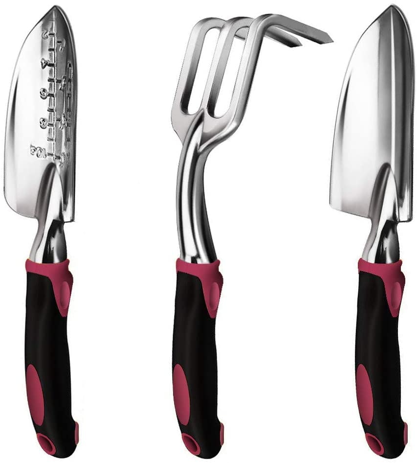 When it comes to digging tools, especially at a small scale, your most basic tool is a hand trowel. You can buy one individually, but they also come in sets with other useful tools — like a transplant trowel (with a sharper edge and a ruler to see how far you’re digging), and a hand rake.