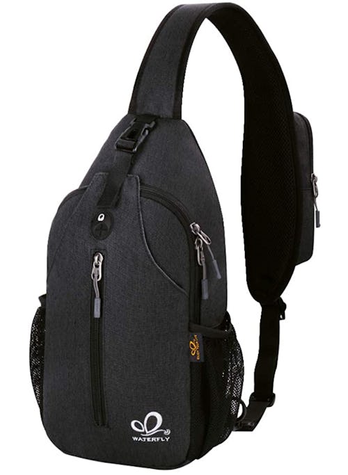 If you’re wondering what to bring on a short hike, this crossbody backpack may be the answer, as it’s non-bulky but still gives you plenty of space for day hiking essentials. Made from durable nylon and polyester, it has a mesh backing for enhanced breathability, a pair of mesh side pockets that are designed to hold your water bottle and an umbrella, as well as several interior compartments for the rest of your supplies. The adjustable padded strap can be worn in the front or the back. Besides neutral gray and black, this pack is also available in high-visibility colors including orange and yellow.