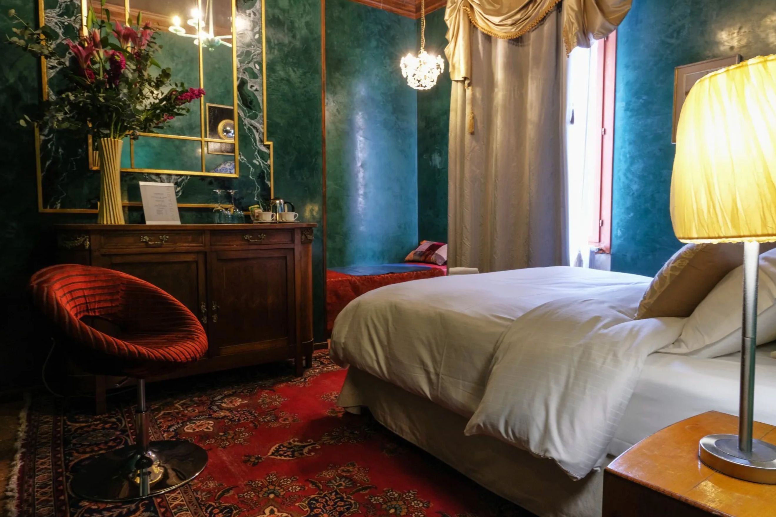 Inside, it’s equally unique – the Venetian-American couple who own it have gone for a sober palette of lagoon colours (eau de nil, grey, a hint of blue) paired with antiques they’ve done up themselves (they have a furniture restoration business).