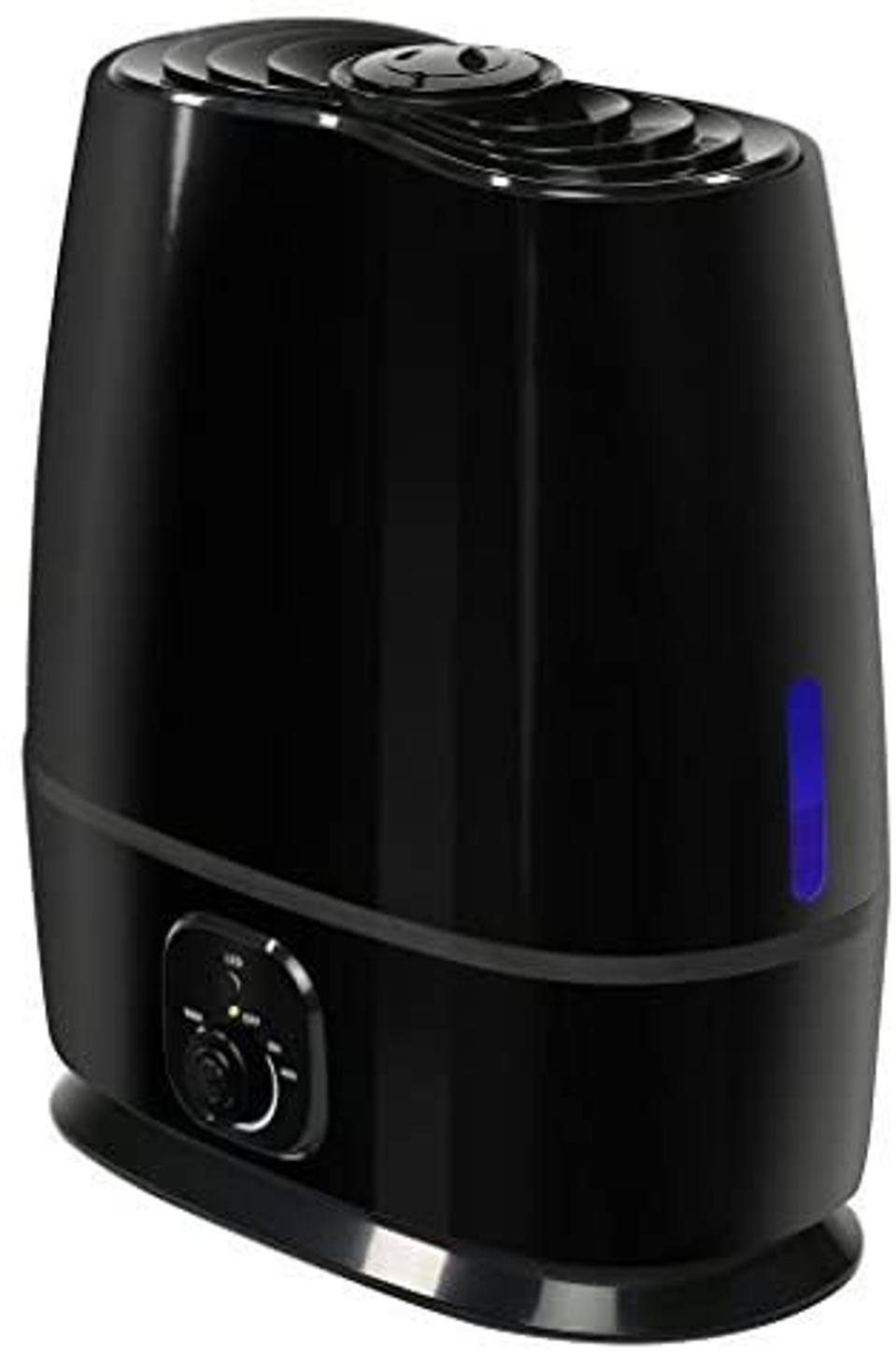 This cool mist humidifier is one of the top-rated options on Amazon, thanks to its reasonable price and reliable operation. The teardrop-shaped unit can hold around 0.4 gallons of water at a time, which allows it to run for up to 25 hours. There are high or low mist settings, and a 360-degree nozzle allows you to direct the mist in any direction. The plastic construction is BPA-free, and it has an optional night light that glows a soft blue color.