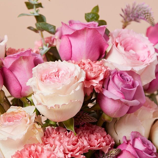 For a classic pink bouquet, look no further than Tickled Pink from The Bouqs Co. This arrangement features pink roses, pastel pink carnations, and fluffy purple matilda in a classic white vase.