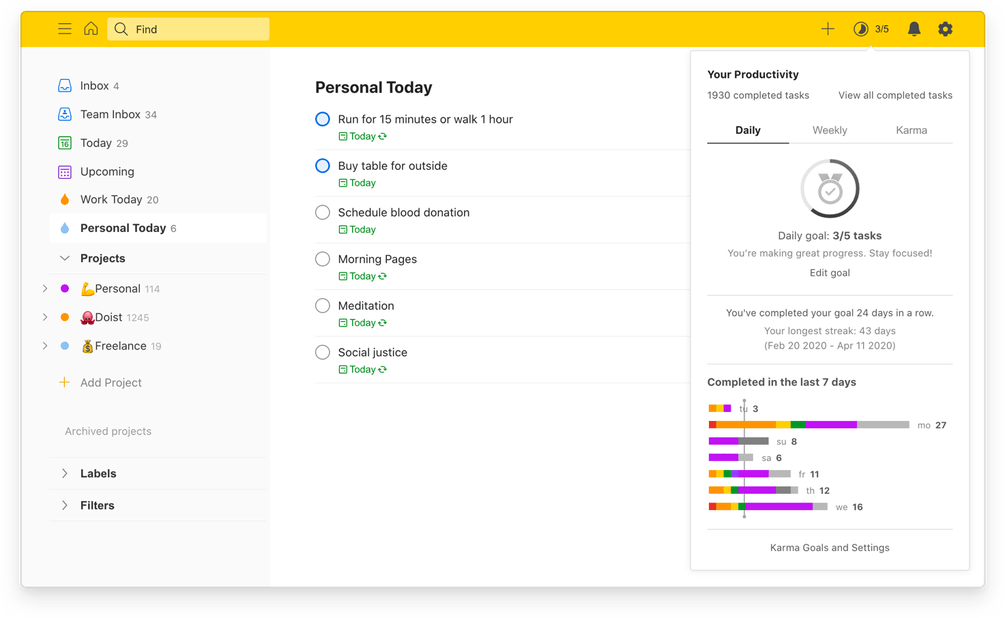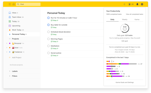 Todoist is a light, simple-looking app with a lot of depth. Right off the bat, you’ll be able to add tasks to your lists or create new lists that can get you closer to your goals. There are a lot of features available to keep your tasks sorted such as tags or labels, prioritization levels, and filters. It can also send reminders to your email or phone.