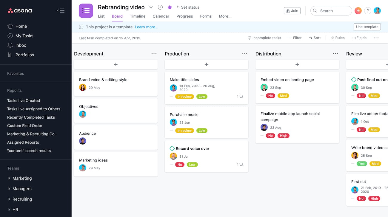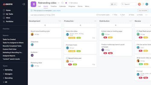 Asana is a free or paid software that focuses on keeping teams on track through the use of colorful tabs and a clean interface. It's super focused on businesses, so it features a lot of details you can add to each card to make sure your teammates know what you're working on. There are also graphs that show how productive the group is and whether everyone is on track to finish a project.