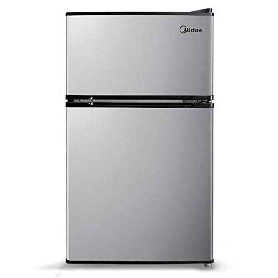 This Midea 3.1 Cu. Ft. Compact Refrigerator has a completely separate freezer compartment that will make you wish you had this mini fridge in college. This mini two-door top freezer fridge has features found in standard sized fridges such as two removable glass shelves, a transparent produce drawer, and an adjustable thermostat. The fridge door has a rack specifically for canned drinks and can also hold a 2-liter bottled beverage. You’ll never have to worry about half-melted ice cream pints because the top freezer will store your frozen favorites in temperatures from -11.2F to 10.4F. You can choose from three color options: black, white or stainless steel.