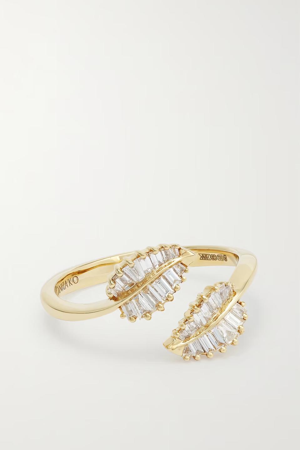 Los Angeles-based Anita Ko is known for rings that take inspiration from California, with their organic shapes and wistfully elegant designs. This palm leaf diamond ring has a modern open shape, cast in 18-karat gold with baguette-cut diamond leaves.