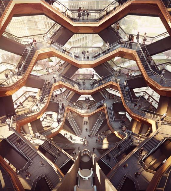 Designed by Thomas Heatherwick, founder of London's Heatherwick Studio, the Vessel will include 154 flights of stairs, which intersect to form an Escher-esque lattice of infinite walkways. The structure will have nearly 2,500 steps and 80 landings, totaling a mile of pathway above the plazas and gardens below.