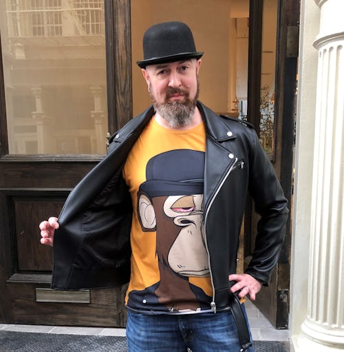 Back in the gallery line, I meet Kevin Rupp, a 37-year-old from California who is dressed like his ape, in a black bowler hat and leather jacket. He’s a digital artist who says he’s friends with Mike Winkelmann, better known as the artist Beeple, who sold an NFT at Christie’s auction house for more than $69 million in March.