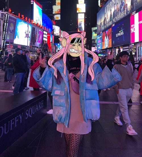 Among the blue- and black-sweatshirt-wearing men mingling with Stellas in hand, I spot Sera, who is 29 and from Hawaii. She’s wearing an outfit she made, which features her ape on a shirt. Unlike the other apes I’ve seen so far, hers has long, styled, bubblegum-pink hair.