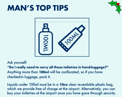 Manchester is conducting a Twitter campaign aimed at speeding up security queues over Christmas. “Unzip, unfasten and unbutton your big winter coats whilst queueing up,” passengers are told.