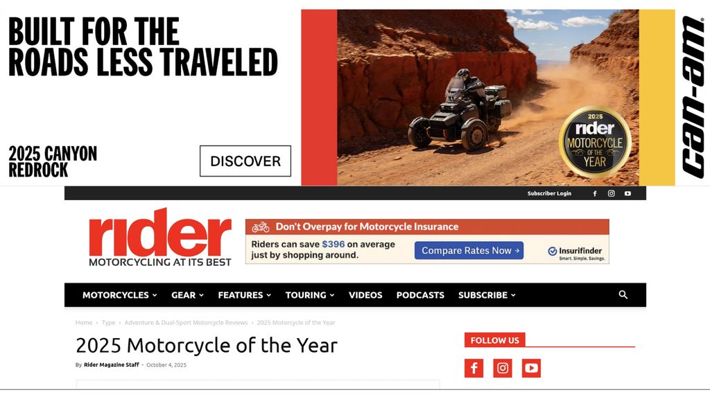 If you view the actual piece on Rider's website, there's a Can-Am Canyon ad right up at the top for the 2025 Canyon Redrock, complete with a "2025 Rider Motorcycle of the Year" seal on the image included in the ad.