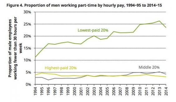 And while part-time work among the lowest paid men has ballooned, rates have not changed for better paid men.