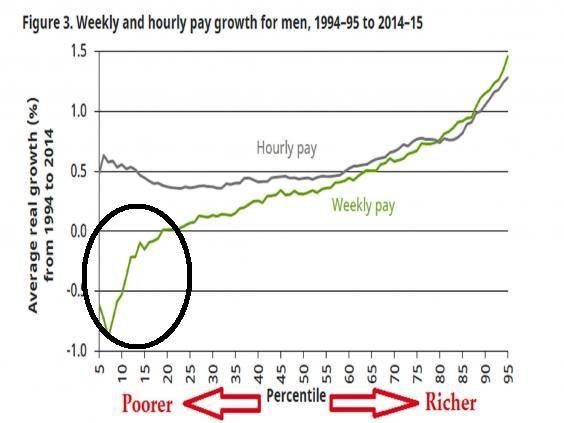 The IFS research shows that average inflation-adjusted annualised weekly pay growth for the lowest fifth of the male income distribution was zero or less between 1994-95 and 2014-15, while for men further up the income distribution real weekly pay has grown.