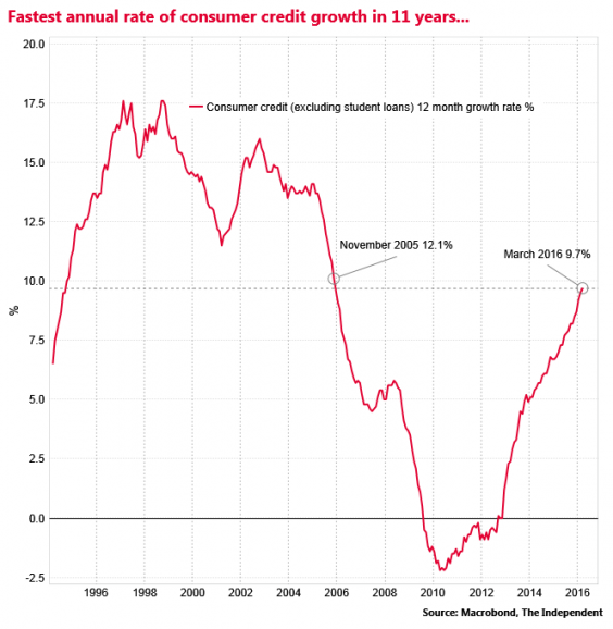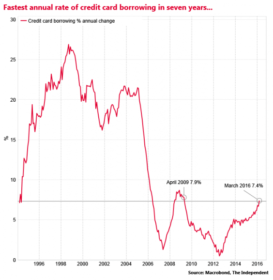 We shouldn't, of course, put too much emphasis on a single month's figures. But the 12 month comparison of the level of credit card debt is showing a similar story. In March 2016 it was rising at an annual rate of 7.4 per cent, the fastest in seven years. And the growth rate has been steadily climbing since 2012: