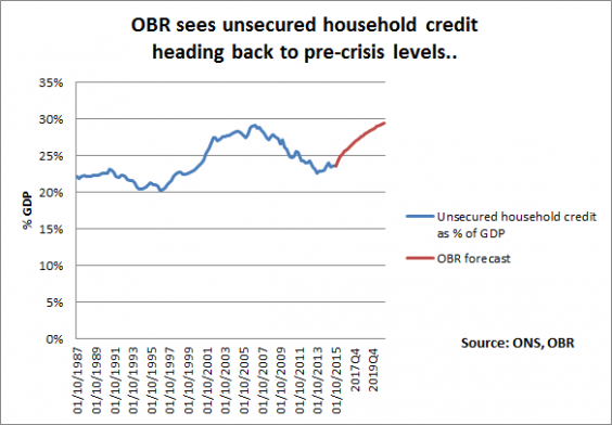 The OBR sees household unsecured growth rising rapidly over the next four years to around 30 per cent of GDP. That's just roughly where it was when the financial crisis struck: