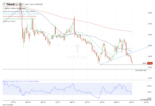 Once the $18 level gave way, that was the line in the sand that told bullish traders to change their tune and bail. Now below all of its key moving averages, AT&T stock is barreling toward its multi-year low of $16.62.