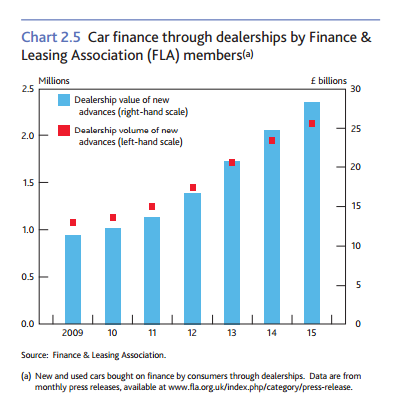 So what’s going on? New car loans – where dealerships lend the money to the customer to complete their purchase - are a big factor. The Bank draws attention to data from the Finance & Leasing Association showing that the value of new advances in 2015 was £28bn – double that of 2011: